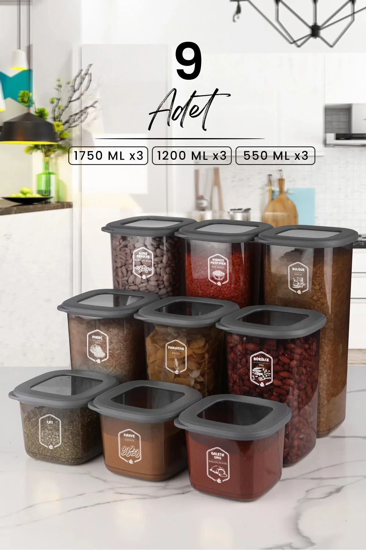 Avantajlı 9'lu Antrasit Etiketli ve Kaşıklı Boly Kare Saklama Kabı Seti 550ml - Çoklu Set Yapılabilen Set Erzak Kavanoz